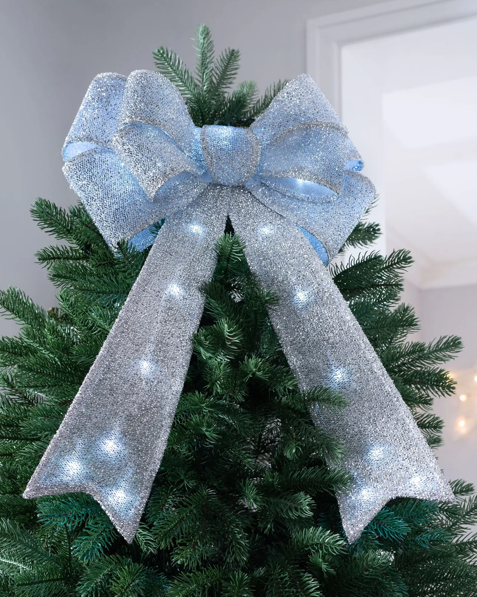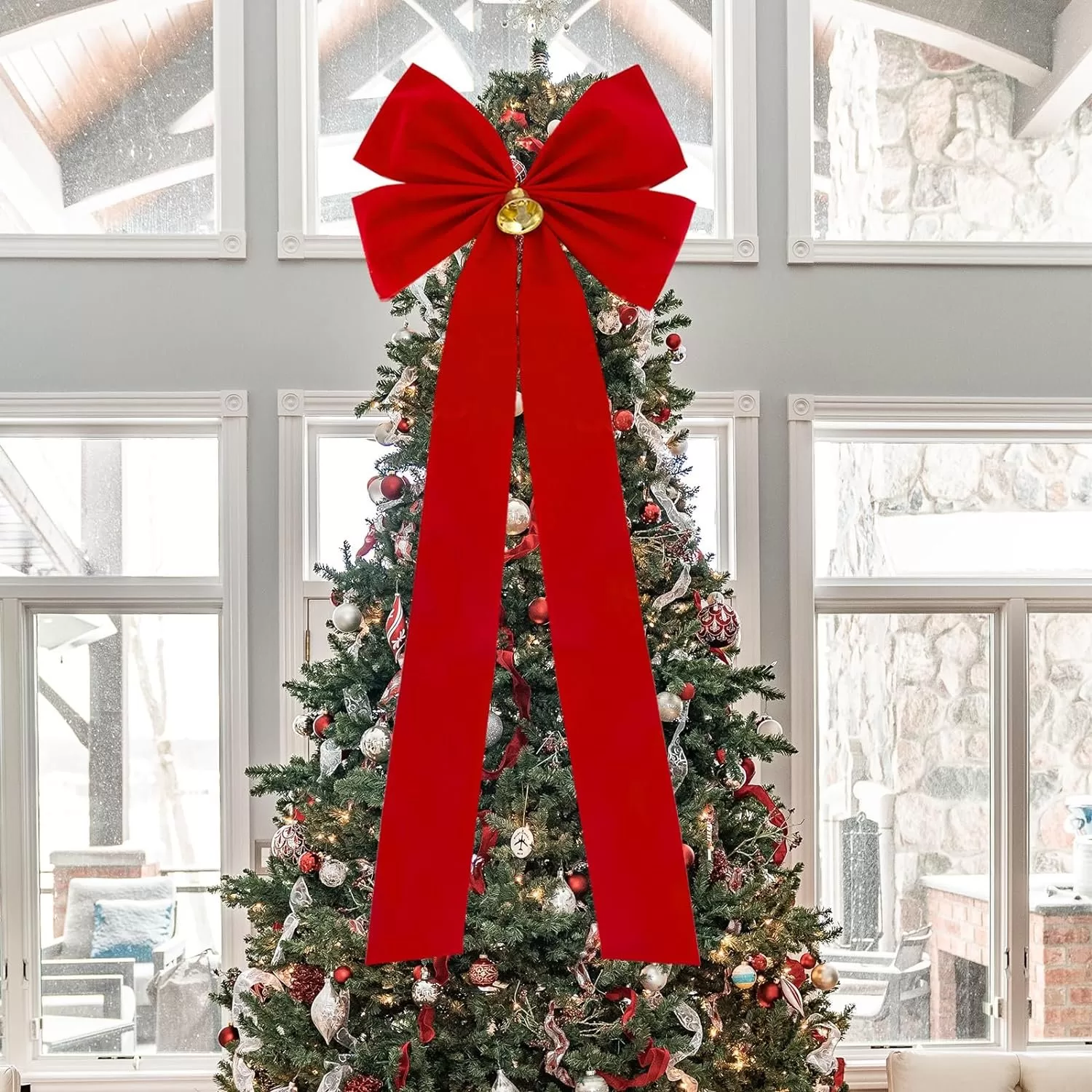 Đặc biệt với những chiếc nơ bản lớn, có đuôi dài phủ theo độ dài cây thông giúp tạo nên hình dáng cây thông đẹp, hoành tráng.