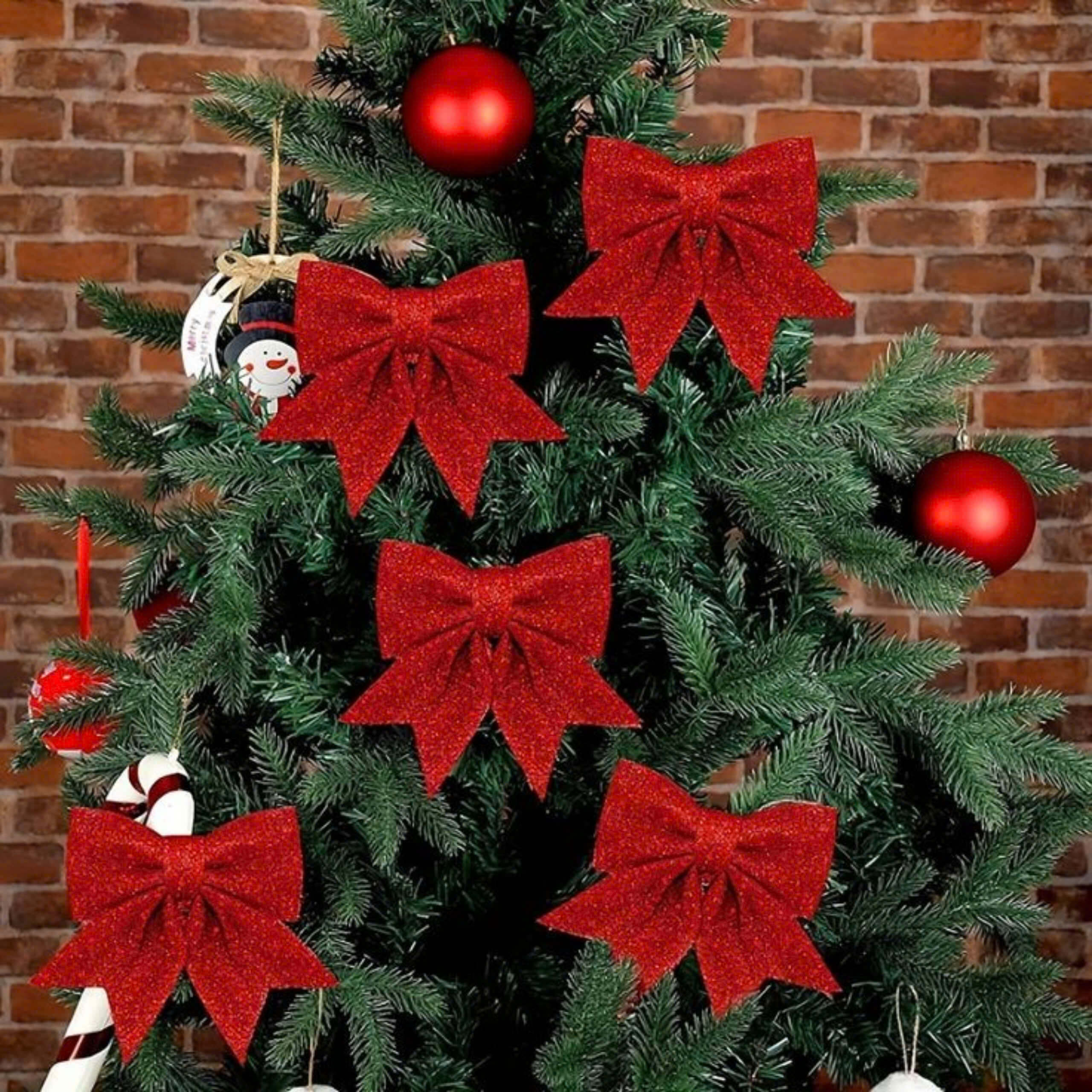 Nơ trang trí không chỉ là điểm nhấn cho cây thông mà còn giúp cân đối không gian tổng thể. Bạn có thể đặt nơ ở phần đỉnh cây, hoặc đan xen những chiếc nơ nhỏ xinh dọc theo các nhánh cây để tạo hiệu ứng bắt mắt, đầy sáng tạo. Một ý tưởng thú vị là sử dụng nơ có màu sắc tương phản với các đồ trang trí khác trên cây để tạo sự nổi bật. Ngoài ra, việc kết hợp nơ với các loại đèn trang trí sẽ tạo ra những hiệu ứng ánh sáng lung linh, thu hút mọi ánh nhìn. Đặc biệt, nơ lớn có thể được gắn ở phần đỉnh của cây thông để tạo điểm nhấn ấn tượng nhất.