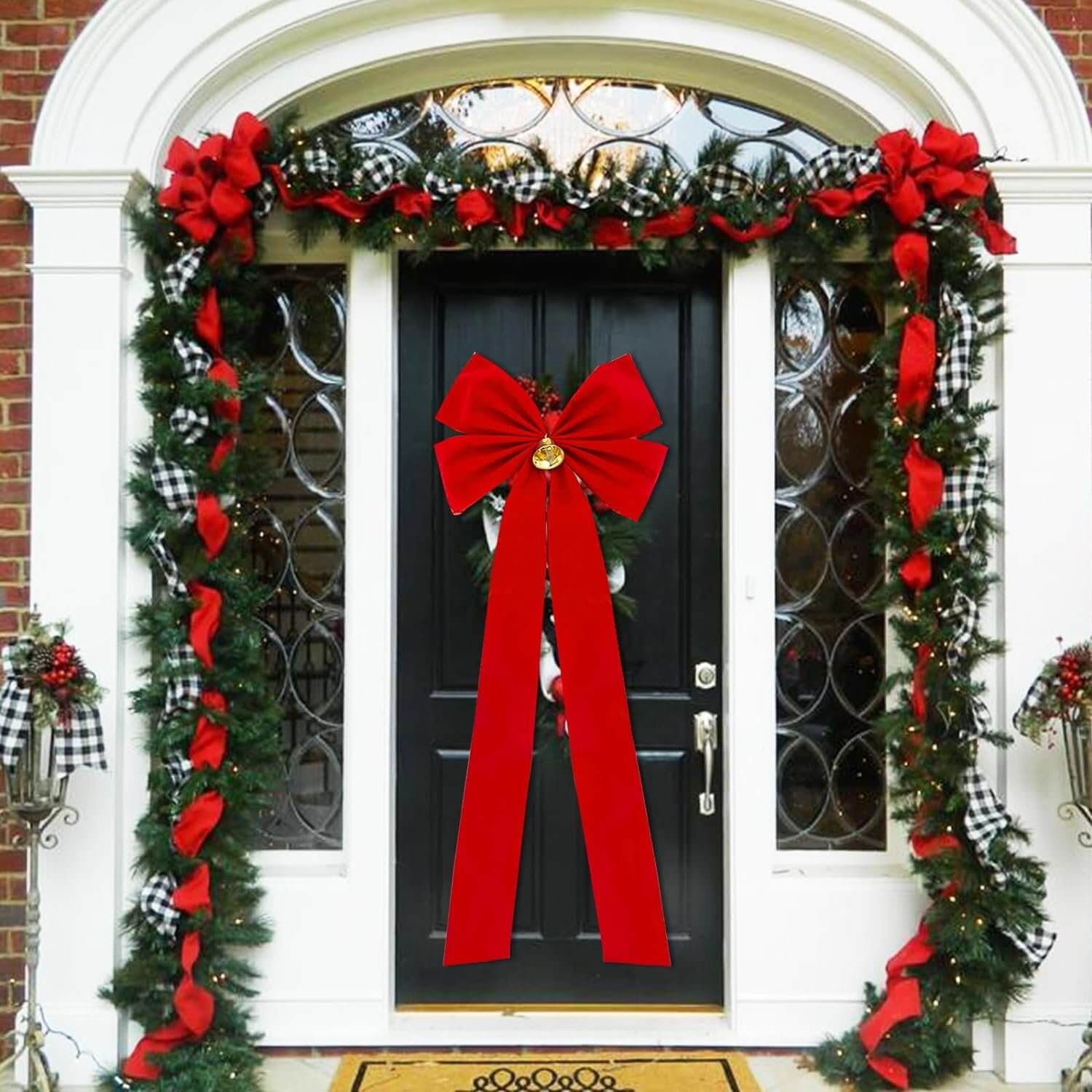 Đặt một chiếc nơ lớn ở cửa ra vào không chỉ giúp tạo điểm nhấn mà còn thể hiện sự chào đón ấm áp. Kết hợp với vòng nguyệt quế hay dây đèn, không gian trước cửa nhà sẽ trở nên lung linh, ấn tượng. Điều này không chỉ tạo ra một bầu không khí thân thiện mà còn thể hiện phong cách của gia chủ.