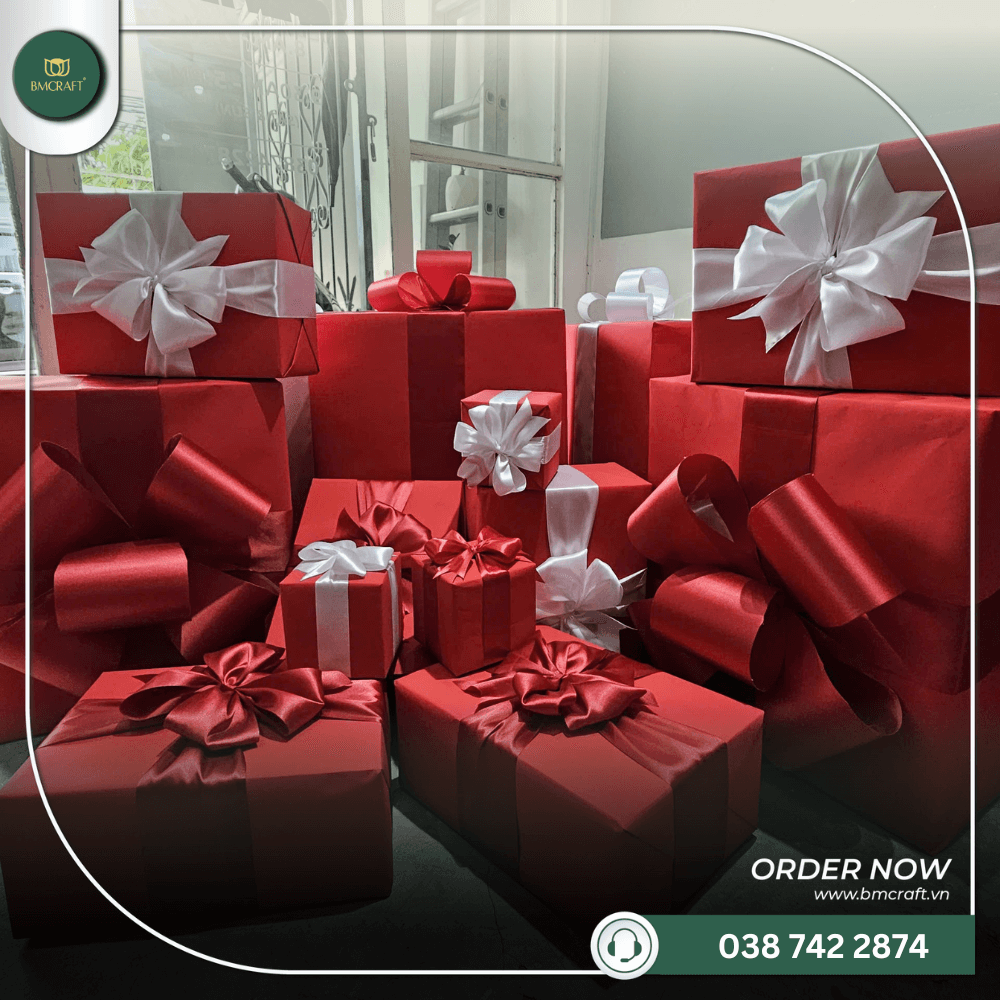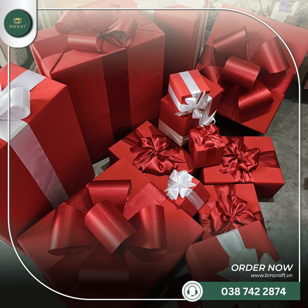 – Bộ hộp quà trang trí với giấy gói, nơ thắt.