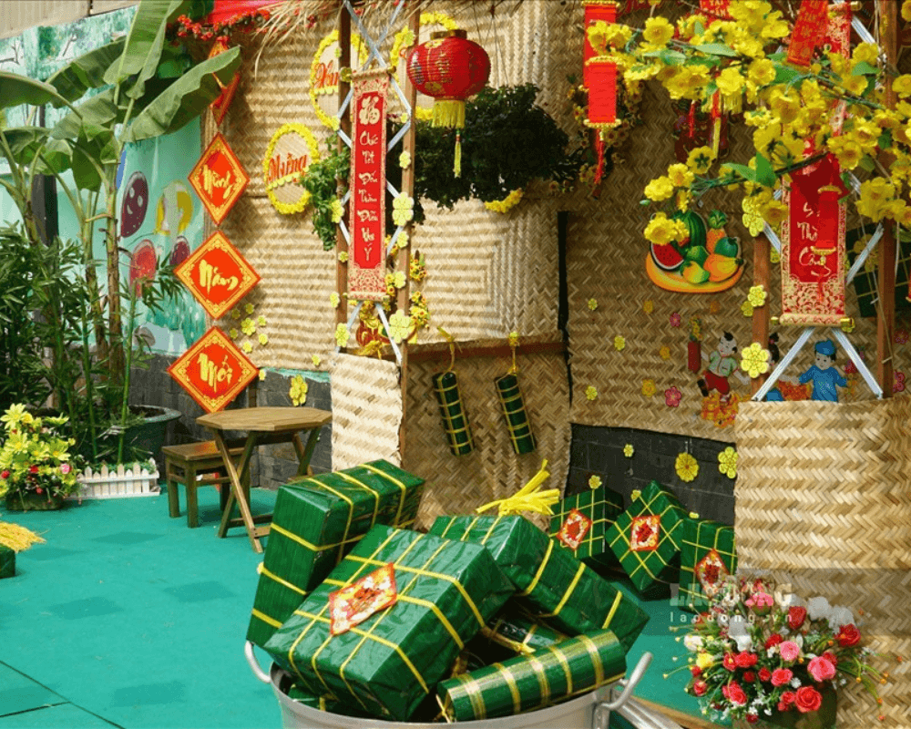 • Biểu trưng, mô hình trang trí chủ đề Tết: Mô hình bánh chưng, dưa hấu, câu đối… được chế tác tinh xảo, tạo điểm nhấn ấn tượng cho không gian.