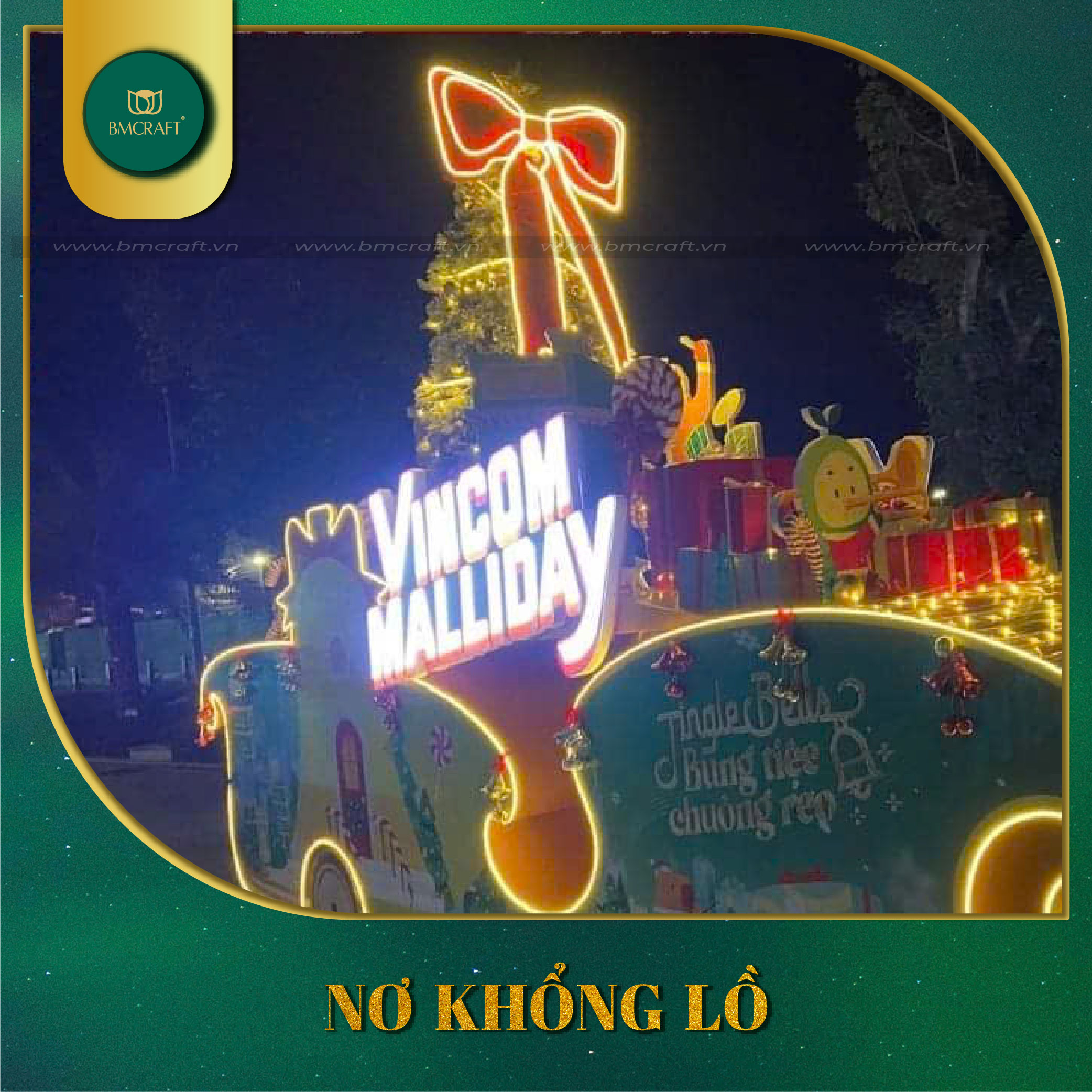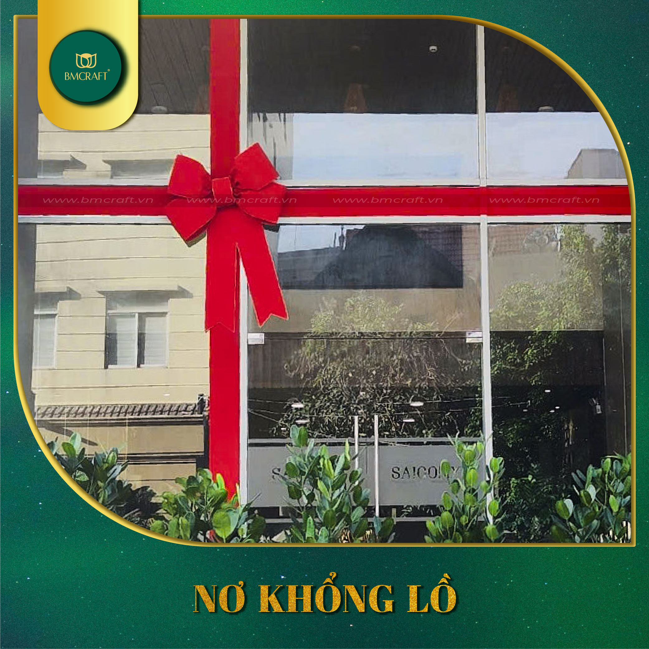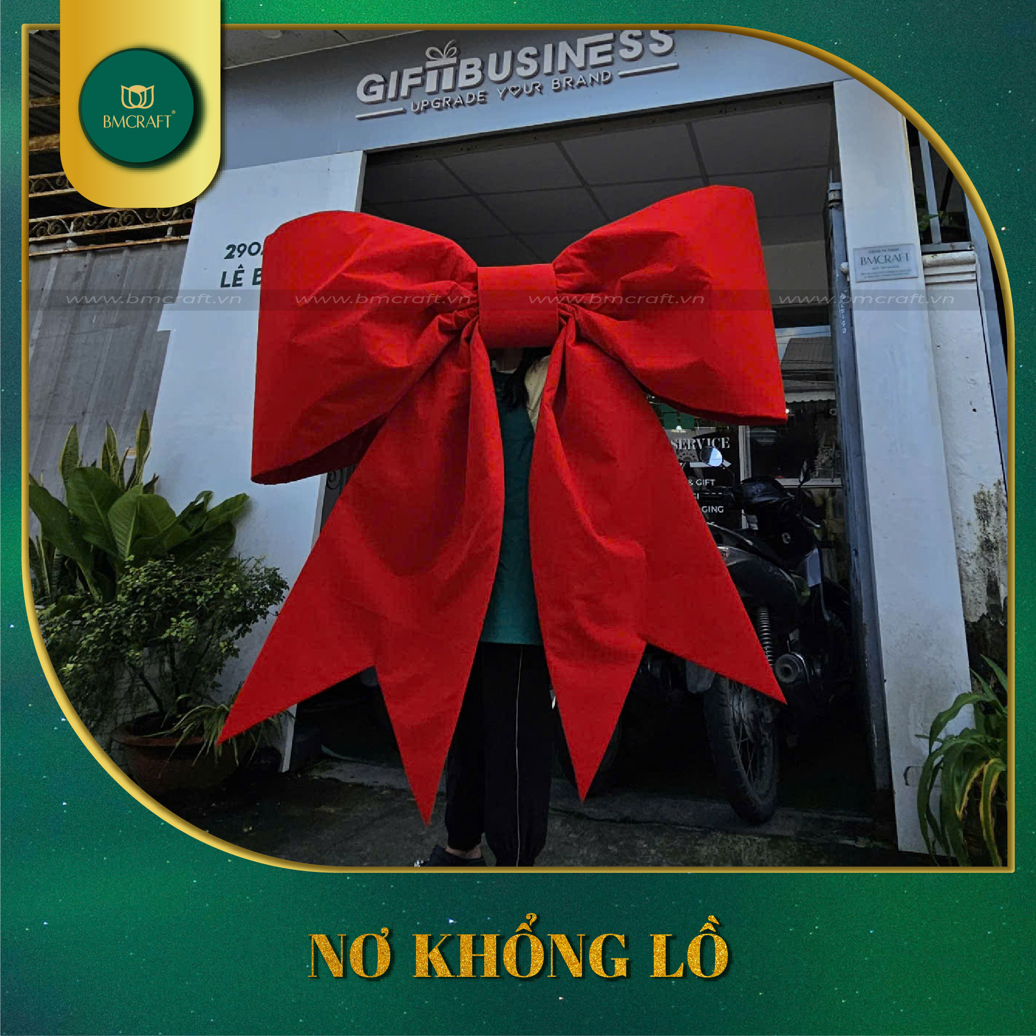 - Nơ trang trí Giáng sinh: nhiều kích thước, phù hợp cửa ra vào, quầy lễ tân hoặc backdrop sự kiện. Đặc biệt, BMCRAFT có kinh nghiệm thực hiện những sản phẩm nơ khổng lồ có kích thước ngang lên đến 4 mét.