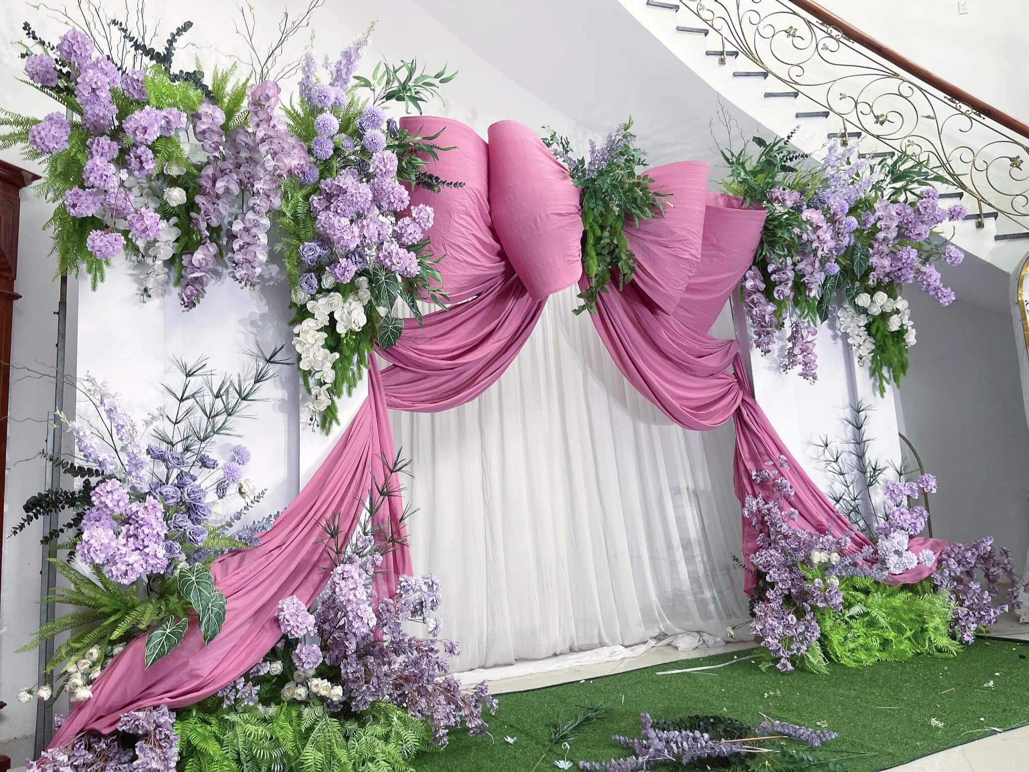 Nơ lụa lớn treo phía trên cổng cưới để tạo cảm giác trang trọng. Sử dụng những chiếc nơ lớn màu trắng hoặc hồng nhẹ nhàng, treo phía trên cổng cưới tạo nên vẻ đẹp sang trọng và lãng mạn. Đây là lựa chọn lý tưởng cho các cặp đôi muốn tạo không gian cưới vừa tinh tế vừa thanh lịch.