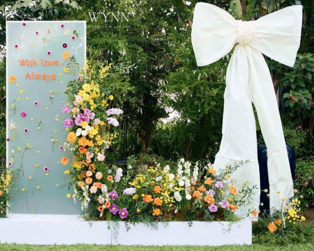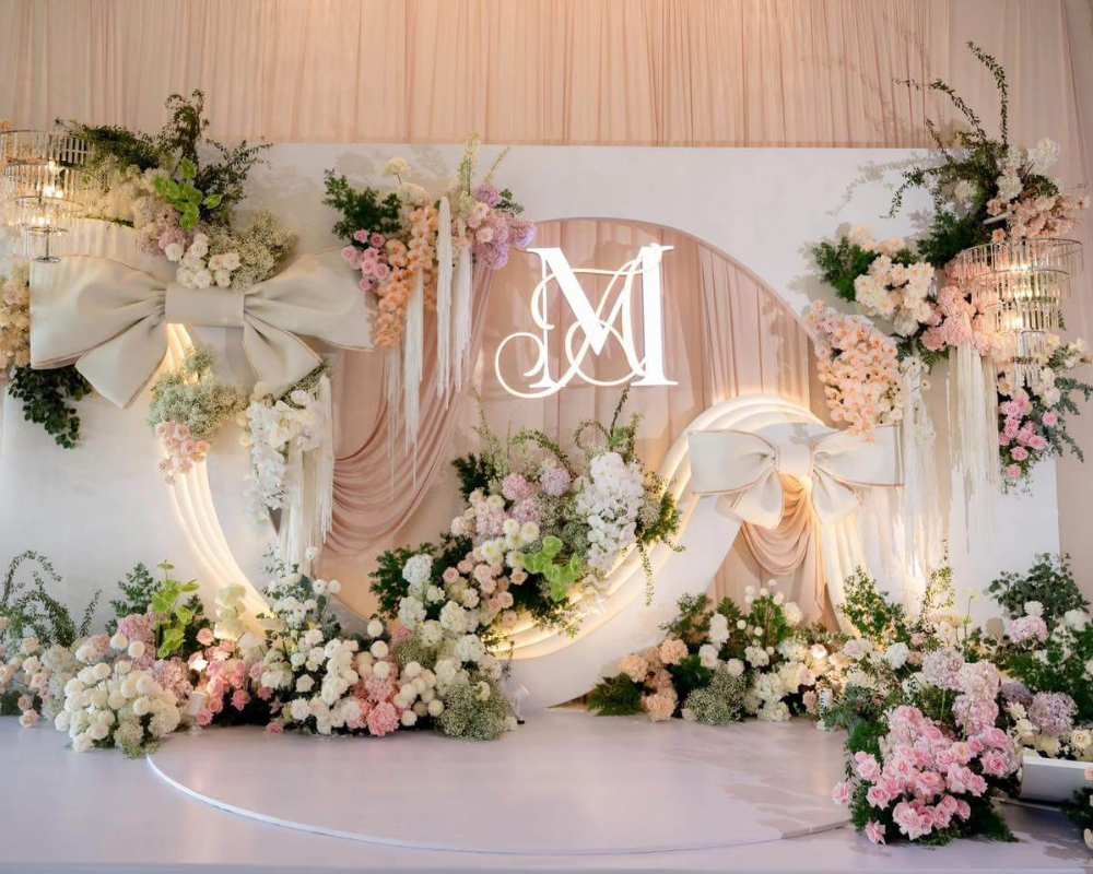 Sử dụng nơ lớn làm backdrop cho khu vực chụp ảnh cưới. Một chiếc nơ lớn được đặt làm phông nền cho khu vực chụp ảnh cưới sẽ là điểm nhấn hoàn hảo, giúp tạo ra những bức ảnh cưới đẹp và lãng mạn. Bạn có thể tùy chỉnh kích thước và màu sắc nơ để phù hợp với phong cách chụp ảnh của mình.